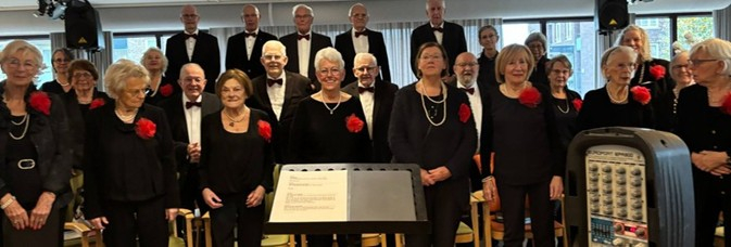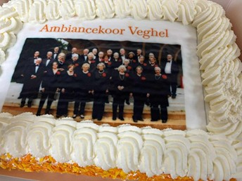 Wat een verrassing!!! Twee prachtige taarten stonden daar klaar en ook Jan van den Berg met zijn vrouw Thea en zijn kinderen waren opeens aanwezig. Het was het feest! In november 2025 waren Jan en Thea van den Berg 60 jaar getrouwd, dat wilden ze samen met het koor vieren en Jan wilde zijn laatste repetitieavond een feestelijk tintje geven! Vanaf 2005 was Jan al lid van het “Ambiancekoor” in Veghel.